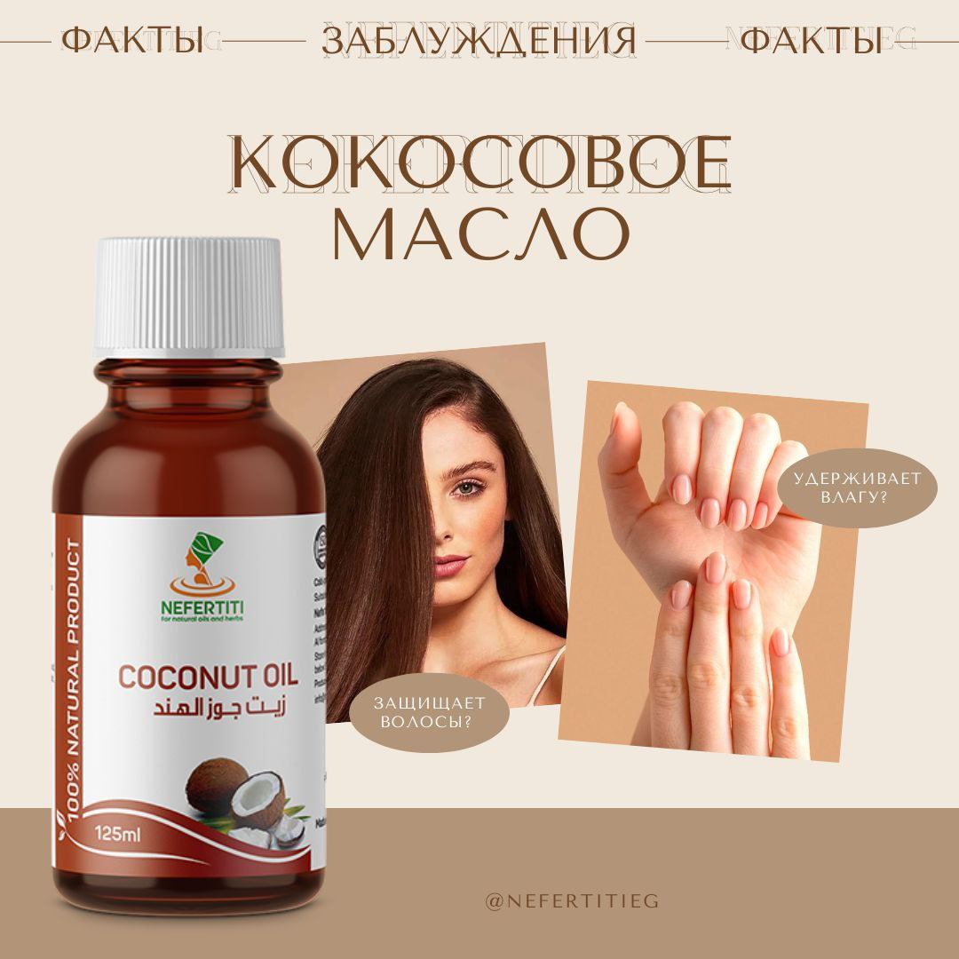 Факт: Кокосовое масло не только великолепное кулинарное масло, но также обладает целым рядом других применений. Масло Нефертити может использоваться в качестве натурального увлажнителя для кожи и волос, ингредиента в домашних косметических рецептах, а также как массажного масла.
